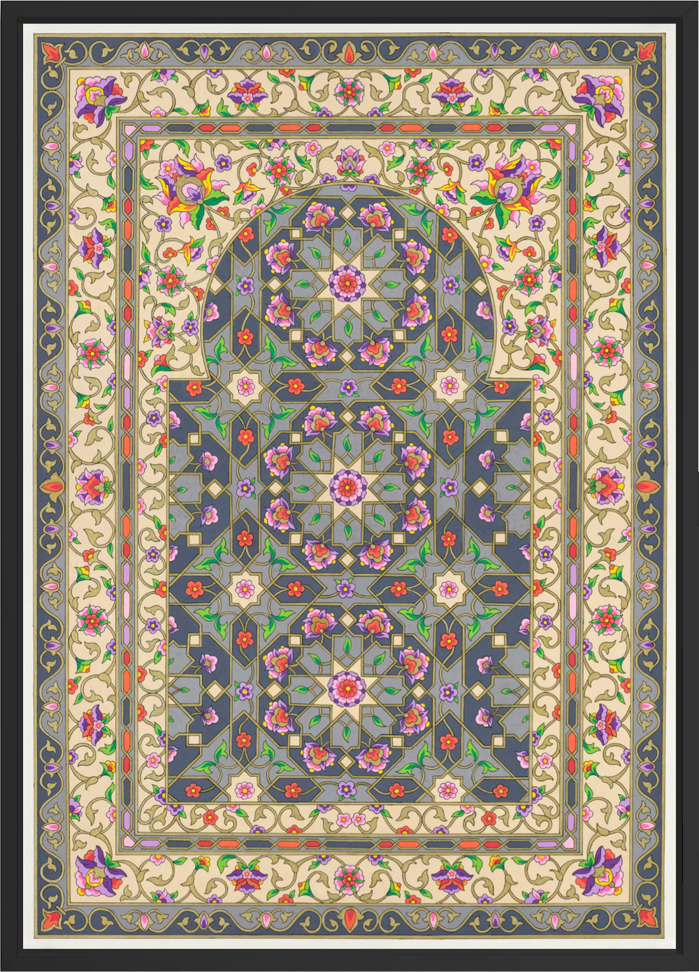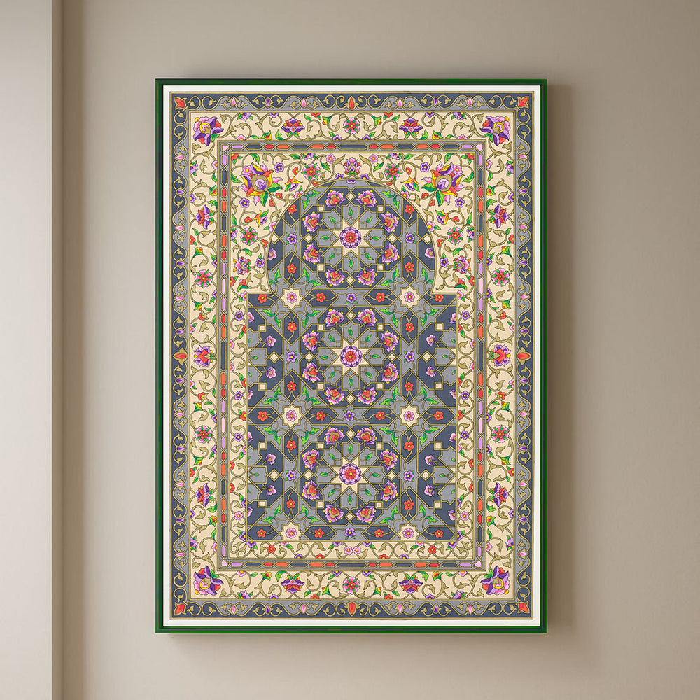 This piece is an intricate hand-drawn work rooted in Islamic geometry, layered with delicate floral motifs and a rhythmic symmetry. Interlacing geometric structures unfold across the surface, softened by ornamental detail and a carefully balanced composition.