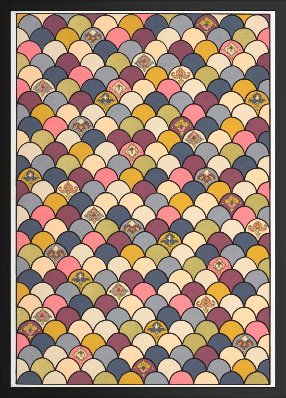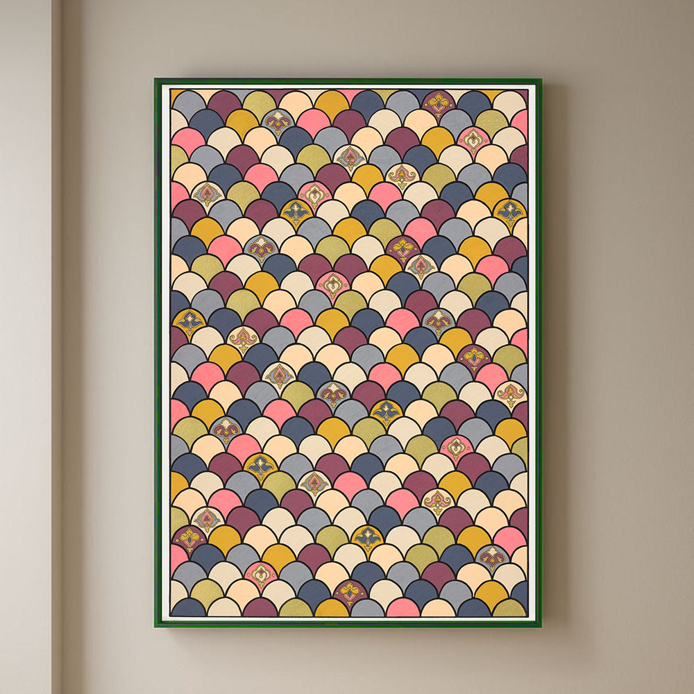 This piece unfolds as a gentle rhythm of repeating arches, layered like scales or petals in quiet procession. Soft, muted tones flow calmly across the surface, creating a sense of balance, continuity, and ease. Subtle ornamental details emerge at intervals, inviting the eye to pause and wander. The composition feels meditative, steady, and quietly uplifting.